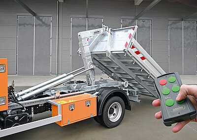 Der Dreiseitenkipper Typ UDK verfügt über einen integrierten Rampenschacht mit klappbarem Kennzeichenhalter und das Ladungssicherungssystem Spinlock. Die Ladefläche aus robustem Stahlboden kann mittels Elektro-Hydraulik sowie der zusätzlich montierten Notpumpe Pumpless auf drei Seiten gekippt werden. Am Ausstellungsfahrzeug sind zu Demonstrationszwecken zwei Werkzeugkisten unter der Ladefläche sowie ein 650 mm hoher Gitteraufsatz und ein 550 mm hoher Bordwandaufsatz aus Aluminium montiert.