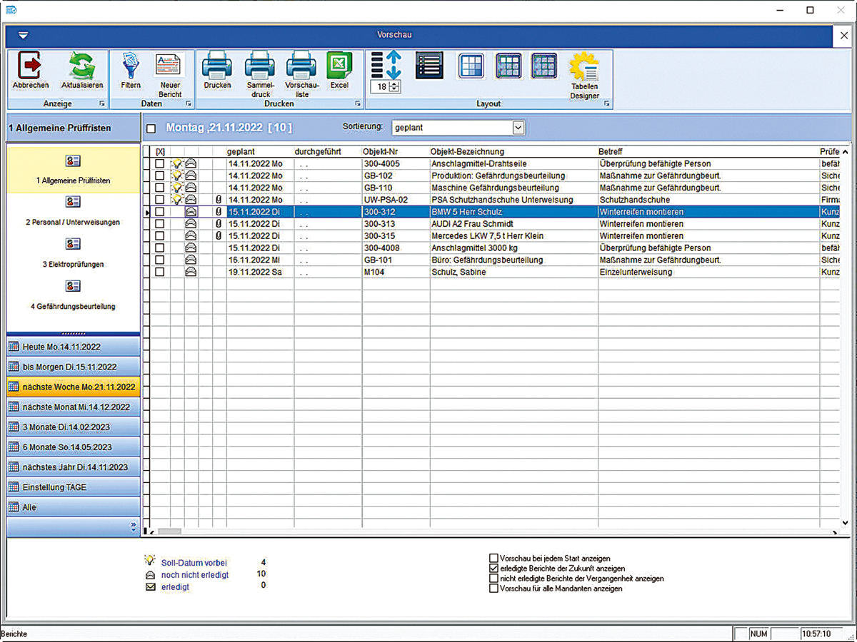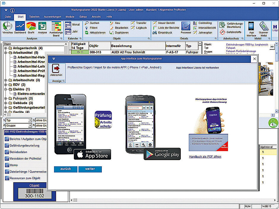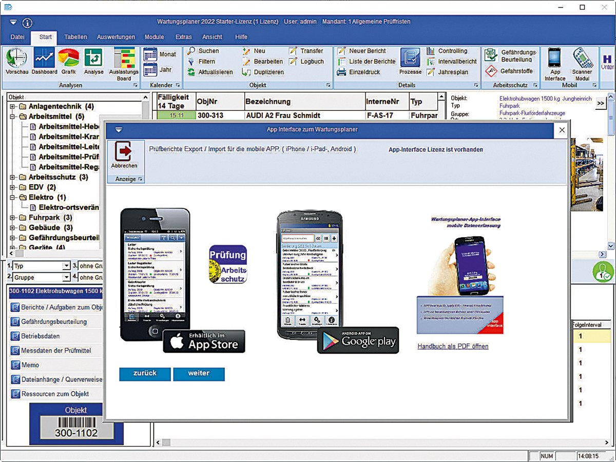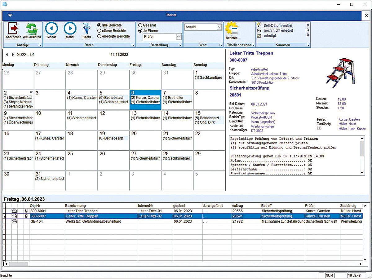 Eine leistungsstarke Wartungs-Management-Software reduziert den Arbeitsaufwand im Rahmen der Prüfpflichten eines Unternehmens, zudem sind Prüfberichte bei Betriebsprüfungen stets griffbereit. Es gilt darauf zu achten, dass der Wartungsplaner auf DIN EN ISO 9001 basiert und den Empfehlungen der Berufsgenossenschaften für das Prüffristen-Management entspricht. Er erleichtert die Durchführung von Gefährdungsbeurteilungen, und die Anforderungen aus ISO 14001 zum Umweltschutz und OHSAS 18001 werden ebenfalls unterstützt. Außerdem muss das Tool alle gesetzlichen Anforderungen gemäß BetrSichV, DGUV, TRBS erfüllen. Zusätzlich kann mit dem Wartungsplaner die Prüfung nach BGV oder den Gesetzen des BGG, VDE oder UVV sicher dokumentiert werden.