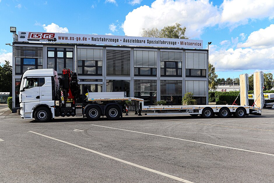 Ergänzend zum Satteltieflader der Marke MAX Trailer hat die ES-GE im März ein weiteres Fahrzeug an das Team des NLBK übergeben. Der 3-achsige Auflieger der Marke ES-GE ist ausgelegt für hohe Punktlasten. Inklusive des verstärkten Rahmens mit Profilquerträgern bringt der robuste Sattelauflieger ca. 6.750 kg auf die Waage. Die Sattellast beträgt 18.000 kg, die Achslast insgesamt 27.000 kg. Technisch bietet der Auflieger eine mögliche Nutzlast von ca. 38.250 kg. Beide Fahrzeuge werden in Zukunft für allgemeine Logistikaufgaben im Katastrophenschutz eingesetzt. Zu den transportierten Gütern gehören bspw. Fahrzeuge, Container oder auch Zelte. „Wir freuen uns natürlich primär über die erfolgreiche Zusammenarbeit. Doch auch wenn unser Beitrag verhältnismäßig gering ist, freuen wir uns ebenfalls darüber, dass wir Helfer und Einsatzkräfte mit unserer Expertise indirekt unterstützen können. Gespräche über weitere Projekte sind bereits geplant“, betont Markus Hurdelhey.
