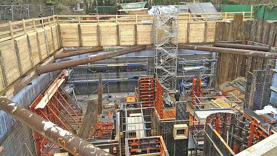 - 1. Höhentakt: Zum Erstellen der Außenwände im zweiten Untergeschoss mit einer Schalhöhe von 5,65 m wurde die Logo 3 als einhäuptige Schalung mit 6 m hohen Stützböcken gesichert.