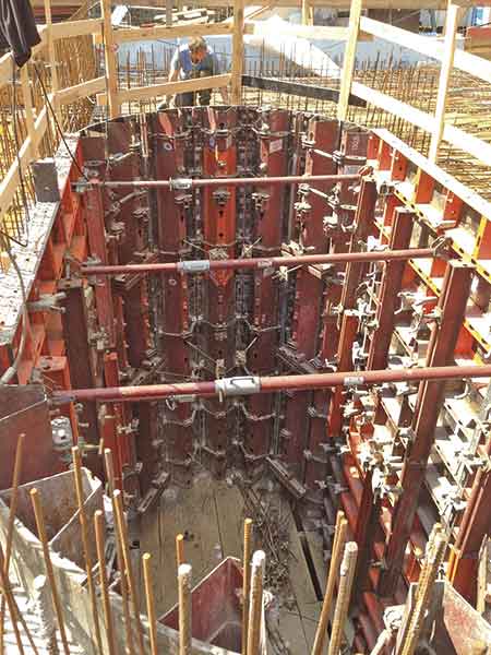 Das offene, außen eckige und innen ovale Treppenhaus mit Betonbrüstung wurde in Kombination der Schalsysteme TTR für den Innenkern und Logo 3 für die Außenbegrenzung geschalt. Die gegenläufige Formgebung stellte nicht die einzige Herausforderung dar, denn die Treppenhauswände setzen sich nicht in allen Geschossen durchgängig fort. Zum Aufnehmen der senkrechten Lasten wurde im zweiten Untergeschoss eine Abfangung konstruiert, geschalt und betoniert.