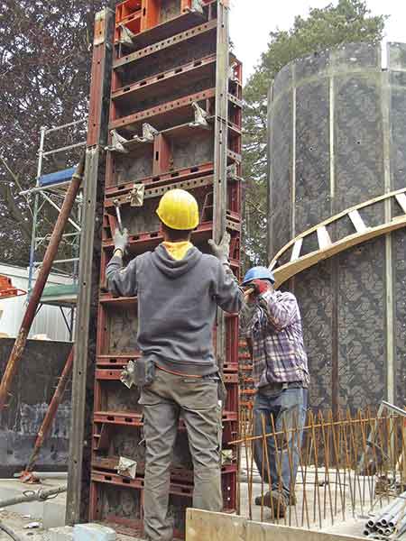 Nach den Erd- und Tiefbauarbeiten startete das ausführende Bauunternehmen mit den Rohbauarbeiten und brachte für die Schalungsaufgaben Paschal mit ins »Spiel«. Der Einkäufer des für den Rohbau verantwortlichen Ingenieurbüros kannte die Vorzüge der Paschal-Systeme seit einigen Jahren und konnte auch den verantwortlichen Projektbauleiter überzeugen. Bei diesem Projekt können alle Schal- und Rüstaufgaben im System gelöst werden, ohne zeitaufwendige Sonderlösungen mit Schalholz herstellen zu müssen. So wurden beispielsweise runde Wandabschlüsse durch die Kombination einer halben Rundsäulenschalung mit Logo-Schalelementen an den Seiten plus zwei Übergangselemente schlüssig geformt. Ein weiteres Beispiel sind die Sichtbetonstützen mit ihrem einseitigen Versprung.