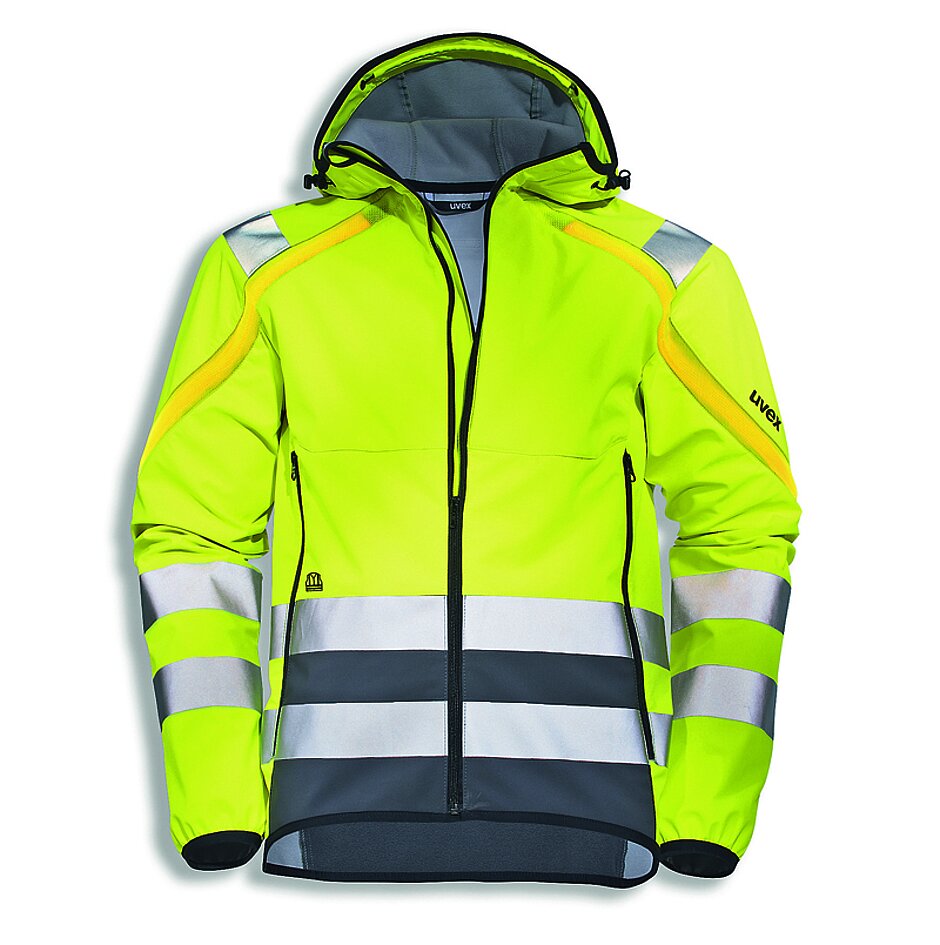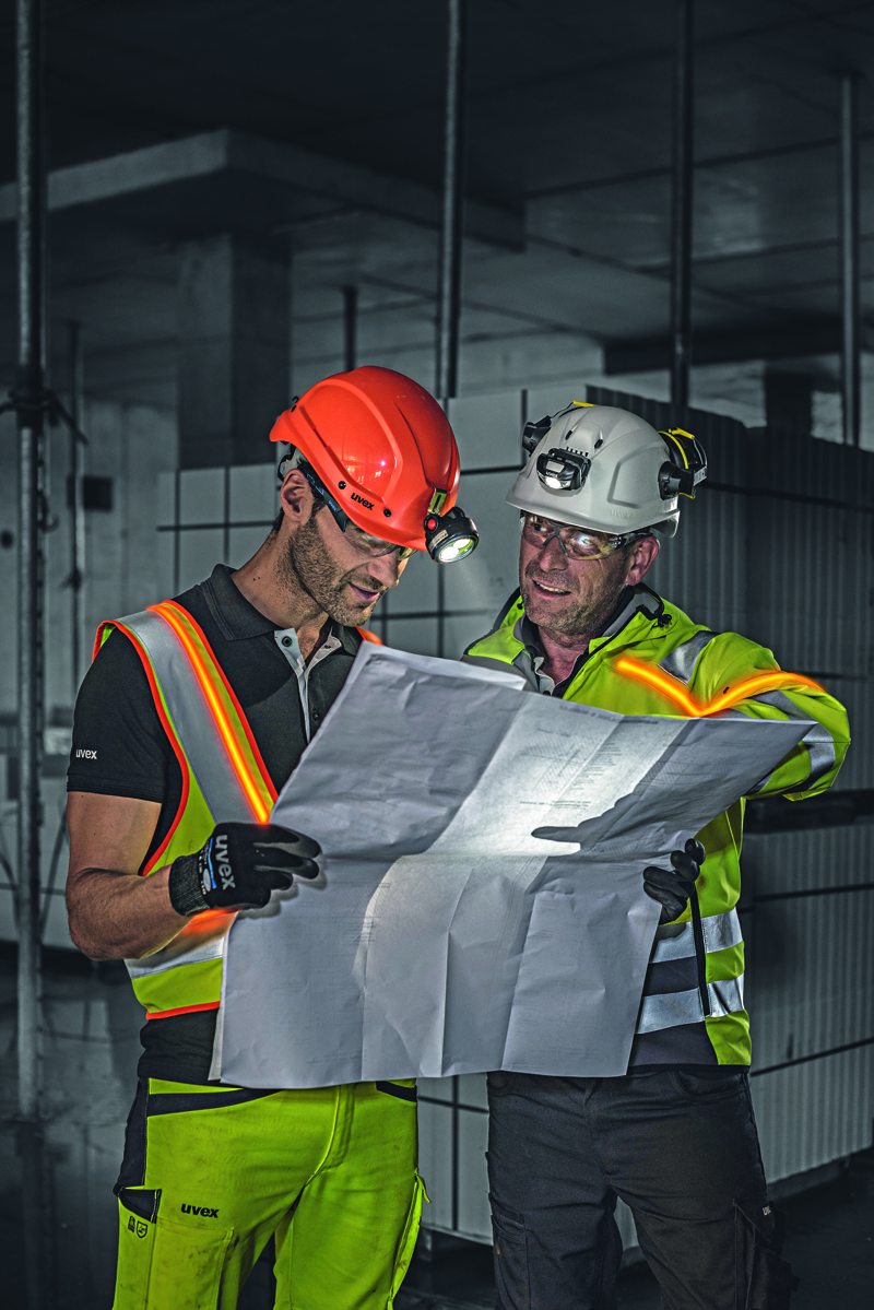 Um Bauteams aber auch im Bereich der Füße zu schützen, hat Uvex robuste Sicherheitsschuhe entwickelt: Der Uvex 2 soll mit seiner metallfreien Zehenschutzkappe und einem geringen Gewicht punkten. Dazu kommt eine hoch wasserresistente Uvex-Softshell-Jacke Protection Active Flash, die über ein akkubetriebenes Lichtleitersystem verfügt. Als Entwicklungsgrund nennt Uvex hier, dass der Bauarbeiter auch bei schlechten Sichtverhältnissen komfortabel und sicher arbeiten kann.