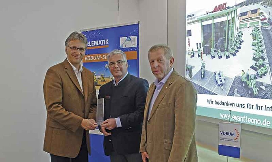 Nach einer kurzen Firmenpräsentation im modernen Schulungsraum des Unternehmens stellte Referent Tino Seitz, Technischer Fachwirt bei Avant, die Palette der 19 unterschiedlichen Avant-Radlader-Typen vor. Für professionelle Baustelleneinsätze, für den GaLaBau, für die Bauwirtschaft, kommunale Bereiche, Landwirte und Industrie – die Einsatzmöglichkeiten für die kompakten Geräte sind vielfältig. Schwerpunktmäßig stellte Seitz den Avant 760i, den neuesten und größten Multifunktionslader des finnischen Unternehmens vor. Interessant ist auch dessen flexible Verlademöglichkeit mit Hänger und Pkw, ein Lkw-Führerschein ist somit für den Transport der leistungsstarken Maschine nicht notwendig. Für den Avant stehen 150 Anbaugeräte für den Einsatz zu allen Jahreszeiten zur Verfügung. Nach der technischen Präsentation ging es dann in die Praxis, um alle Details der Maschine direkt vorzuführen. Der Transport einer Palette mit Pflastersteinen zeigte die Leistungsfähigkeit des Multifunktionsladers. Bei einem Gewicht von 2 100 kg verfügt er über eine Hubkraft von 1 500 kg. Auf dem Avant-Demogelände konnten sich die Teilnehmer auch selbst hinter das Lenkrad setzen und Testfahrten mit dem überraschend wendigen Avant-Lader 760i unternehmen.Gast der Veranstaltung war auch Dieter Schnittjer, Mitglied des Vorstandes und Geschäftsführer der VDBUM-Service GmbH, der sich bei Avant für die interessante Forumsreihe bedankte und Avant-Deutschland-Geschäftsführer Thomas Sterkel einen »VDBUM-Award« als Zeichen besonderer Anerkennung überreichte. Avant Tecno Deutschland ist bereits seit 12 Jahren VDBUM-Mitglied.