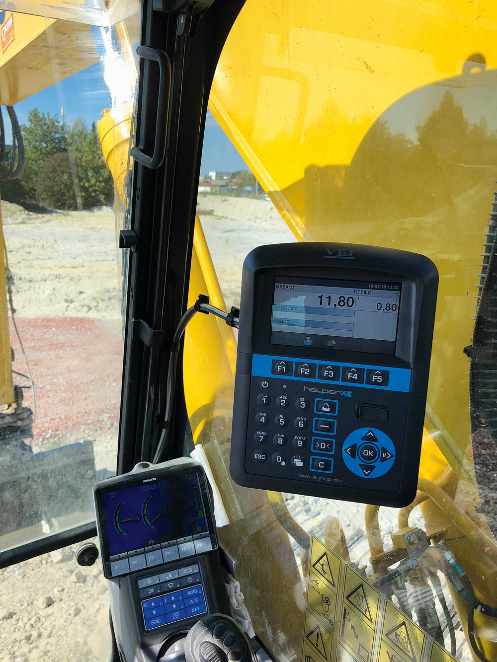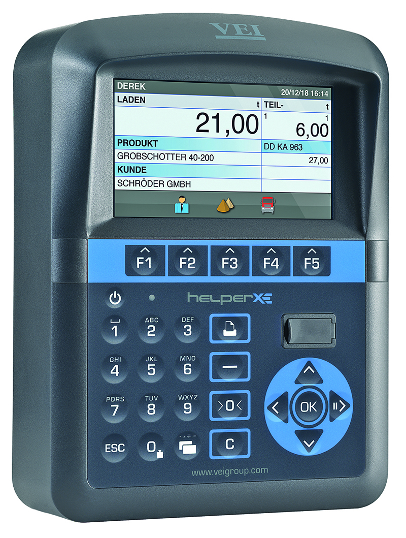 »Mit einer Baggerwaage lässt sich aber nicht nur effektiv ›auf den Punkt‹ eine Überladung vermeiden, sie bietet sich auch als Management-Tool an«, betont Volker Augustin als Geschäftsführer der deutschen VEI GmbH. So lassen sich die Umschlagsmengen auf Großbaustellen ebenso dokumentieren wie beispielsweise die Mengen, die bei der Bestückung von Brechern oder Siebanlagen eingebracht werden. Die Messgenauigkeit der Helper XE gibt das Unternehmen mit ± 2,5 % oder besser an.