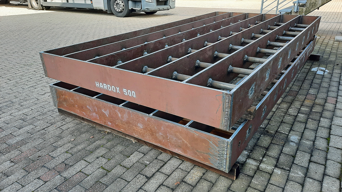 Kürzlich sind in der VeRotool-Werkstatt auch zwei große Vorsiebe aus Hardox 500 gefertigt worden. Bei diesen 3 930 mm × 1 960 mm großen Sieben wurden je neun quer verlaufende Rundstäbe verbaut. Speziell bei dieser Anwendung führen die Rundstähle laut den Ratinger Profis zu einer längeren Lebensdauer der Siebe. Das zu siebende Material treffe hier auf keine Kanten, gleite leichter und verursache dadurch weniger Verschleiß. Zudem seien die verwendeten Rundstähle bereits im Lieferzustand durchgehend auf 500 Brinell gehärtet. Die hervorragende Schweißeignung der Rundstähle ermögliche zudem eine kostengünstige Fertigung. Der Siebquerschnitt bei diesem Sieb wird mit 400 mm × 320 mm in den einzelnen Feldern angegeben. t