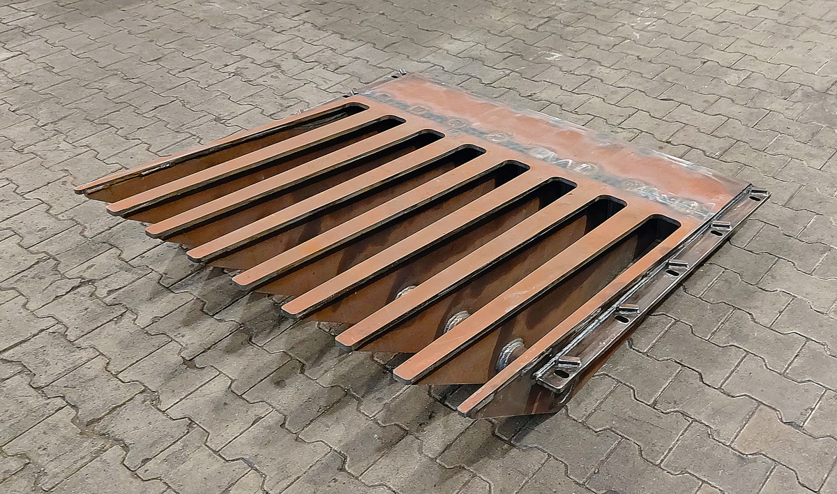 Die Kamm- oder auch Fingersieb genannten Siebe werden bei der Bauschuttaufbereitung in der Materialvorabsiebung eingesetzt. Über diese Siebe werden größere Bauschuttteile und Betonschollen separiert, um nachgeschaltete Lochbleche mit den unterschiedlichen Klassierungen und deutlich kleineren Korngrößen zu entlasten. An den meisten Anlagen sind in Förderrichtung zwei bis drei Fingersiebe terrassenartig angelegt. Wird ein Sieb auch dynamisch belastet, greifen die Spezialisten bei VeRotool auf Hardox 450 zurück, das neben seinen Verschleißeigenschaften auch eine besondere Zähigkeit besitzt. Damit gilt dieses Material als gut geeignet, den durch die Spiralfedern oder elektronischen Vibratoren erzeugten Schwingungsbelastungen standzuhalten. Das Deckblech mit den kammförmigen Ausschnitten ist aus Hardox 500 gefertigt.