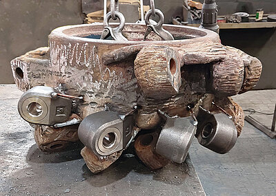 Neben dem Verschleiß von Zähnen und Messern kann es bei den Einsätzen sogar zu einem Bruch der gesamten Brechbacke kommen. Die Instandsetzung derartiger Werkzeuge gehört zu den typischen Aufgaben der VeRotool-Werkstatt.