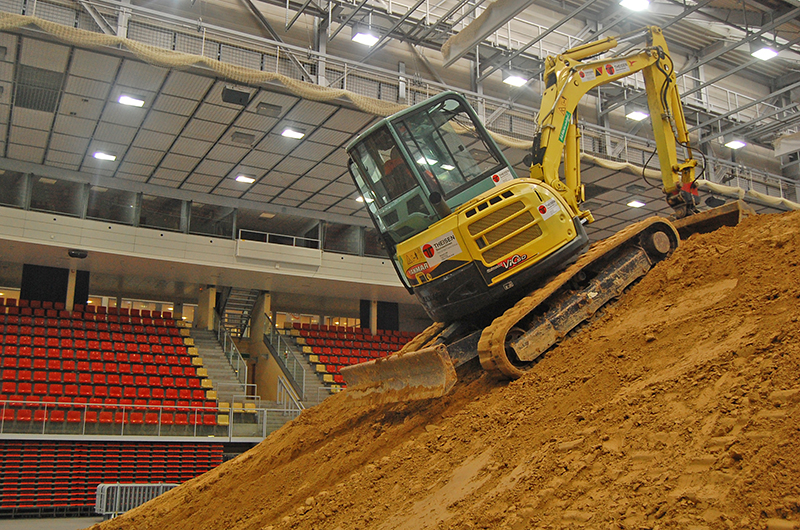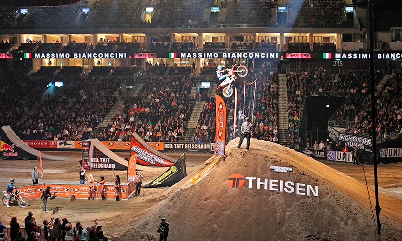 Die Freestyle-Motocross-Weltmeisterschaft steht für spektakuläre Motorrad-Shows. Bei den »Night of the Jumps« genannten Veranstaltungen zeigen Fahrer aus Europa, Australien sowie Nord- und Südamerika atemberaubende, teils bis zu 15 m hohe Sprünge und Salti. Hierfür buchen die Veranstalter die größten Arenen in Berlin, München, Mannheim und Köln sowie in Österreich in Linz und Graz. Der Baumaschinen-Vermieter Theisen engagierte sich erstmals im letzten Jahr als Sponsor und Technical Supplier bei der Weltmeisterschaft. Marketingleiter Steffen Hanus zieht eine positive Bilanz: »Durch die vier von uns unterstützten Veranstaltungen in Berlin, Hamburg, Linz und München und begleitende Werbemaßnahmen konnten wir unseren regionalen Bekanntheitsgrad als Bau-Equipment-Vermieter weiter spürbar ausbauen und dadurch viele neue Geschäftskontakte knüpfen.« Aus diesem Grunde, so Hanus, sei die Entscheidung zur Weiterführung des Sponsorings 2014 schnell getroffen worden.Theisen ist im Jahr 2014 nun bei den Wettkämpfen in Linz, Graz, Berlin (7./8. März), München (26. April), Mannheim (10. Mai) und Köln (4. Oktober) erneut der »Official Technical Supplier« und somit für den Aufbau der Events und das Präparieren der Sprungrampen und Landehügel in den riesigen Hallen mit verschiedenen Baumaschinen verantwortlich. Die enormen Erdbewegungen erledigen Radlader mit diversen Schaufelbreiten im Team mit Mobil- und Minibaggern. Walzen von Theisen werden zum Verdichten der Rampen und Hügel eingesetzt. Im Maschinen-Paket stehen zudem Kompakt-Raupenlader und Teleskopstapler. Auch während der Veranstaltungen ist Theisen im Einsatz: Dann stehen ein Radlader und eine Walze bereit, um eventuelle Ausbesserungsarbeiten an den Rampen schnell und fachgerecht vornehmen zu können.