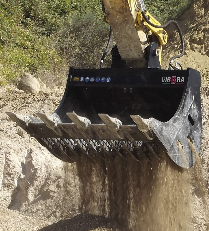 Die Vibbra-Vibrationsgitterlöffel werdem in 30 Größen und Volumen für alle Bagger ab 5 t angeboten. Gitterabstände können individuell nach Bedarf gefertigt werden. Dank dieser Technik entfällt das lästige und verschleißintensive »Schütteln« eines Gitterlöffels ohne Vibration. Der Materialdurchsatz soll exponentiell um ein Vielfaches beim gleichzeitiger Schonung der Maschine gesteigert werden. Durch die fünf Zähne kann der Löffel auch multifunktional eingesetzt werden. Der Anschluss erfolgt über die Hammer- und die Drainageleitung.