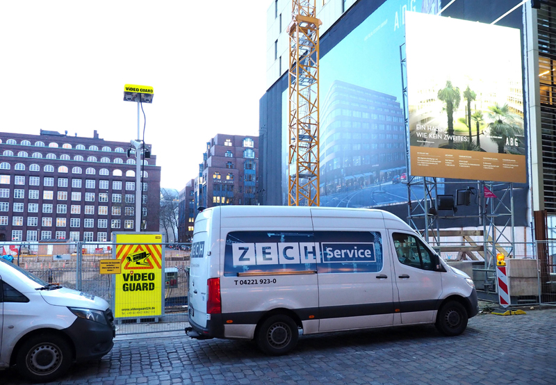 Am Gänsemarkt in Hamburg entsteht derzeit mit dem Deutschlandhaus ein Neubau, der sich gestalterisch an die klassischen Kontorhäuser der Hansestadt anlehnt. Auf rund 40.000 Quadratmetern werden im modernen Backsteinhaus künftig Büros, Wohnungen sowie Einzelhandel und Gastronomie ihren Platz finden. Generalunternehmer ist die Arbeitsgemeinschaft Deutschlandhaus – unter Führung von ZECH Bau. Um Verzögerungen auf der Baustelle etwa aufgrund von entwendetem Material oder gestohlenen Maschinen zu vermeiden, setzen die Verantwortlichen auf das Kamerasystem „Video Guard“. Nach Feierabend und an den Wochenenden, wenn sich keine Mitarbeiter mehr auf der Baustelle befinden, übernimmt Video Guard Professional die Überwachung. Denn in dieser Zeit und besonders in den Abendstunden fühlen sich Täter unbeobachtet. Die Kameras von Video Guard verfügen über einen hochauflösenden Bildsensor und für den Nachtbetrieb zusätzlich über drei Infrarot-Scheinwerfer, deren Licht vom menschlichen Auge nicht wahrgenommen wird. Somit sorgt Video Guard auch bei vollkommener Dunkelheit für hochauflösende Bilder und gewährleistet, dass sich Anwohner und Passanten nicht vom nächtlichen Scheinwerferlicht gestört fühlen. Durch die drei Kameras an den Türmen ist der Bewachungsbereich allumfassend. Ein Schwenken der Kameras ist nicht notwendig und „tote Winkel“ werden vermieden. Das unbemerkte Eindringen auf das Gelände wird auf diese Weise praktisch unmöglich. Erfassen die Kameras Personen auf der zu bewachenden Fläche, greifen die Mitarbeiter der angeschlossenen Alarmzentrale unverzüglich ein. Passanten, die hingegen nur am Grundstück vorbeigehen sowie angrenzende Bereiche, die nicht zum Detektionsbereich gehören, werden nicht vom System erfasst. Hierfür werden rechtlich unzulässige Flächen softwareseitig revisionssicher ausgeblendet. Die Überwachung erfolgt gemäß der Datenschutzgrundverordnung (DSGVO). „Aufgrund der technischen Möglichkeiten lässt sich Video Guard besonders gut in innerstädtischen Bereichen einsetzen“, erklärt Sven-Olaf Hansen, Oberbauleiter von ZECH Bau.