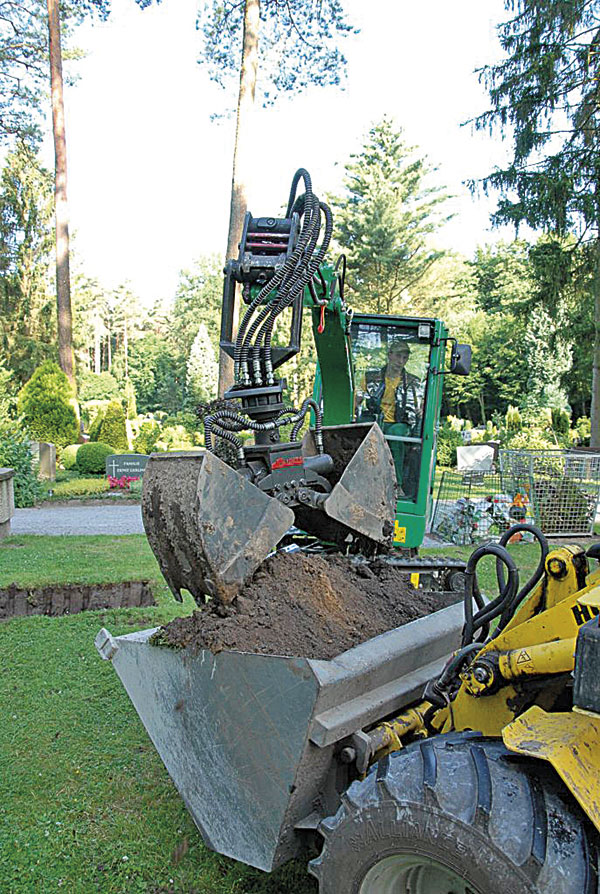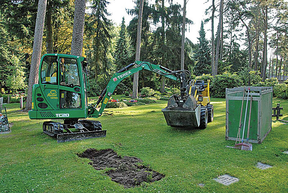 Als offizieller Werksvertragsgärtner auf den Friedhöfen in Steinhagen und Brockhagen erledigt Firmeninhaber Benjamin Merten mit seinem Team von Merten Gärten auch alle Arbeiten rund um die Neuanlegung, Pflege und Umgestaltung von Friedhofsanlagen. Zwei Terex-Minibagger TC20 haben sich als geradezu unentbehrlich erwiesen. Mertens Mitarbeiter Thorsten Höll und Daniel Günter sind auf dem Waldfriedhof in Steinhagen im Einsatz. Der neue, mit dem Schalengreifer ausgerüstete TC20, kürzlich von Terex-Händler Kraemer Baumaschinen aus Rheda-Wiedenbrück geliefert, ist schon vor Ort. »Der Bagger ist einfach zu bedienen und recht leise. Man kann sehr genau mit dem TC20 arbeiten«, lobt Höll. In kürzester Zeit ist der Boden vorbereitet und die Erde verladen. Besonders begeistert sind beide Kollegen von der zweiten Tür am Bagger, die ein schnelles Aussteigen zu beiden Seiten ermöglicht. Auch die Bedienkonsole in der Kabine gefällt ihnen: »Gerade die Schnellgangschaltung ist genau dort platziert, wo sie hingehört.«Nach einer kurzen Besprechung geht es weiter mit den Arbeiten. »Der Einstieg ist bequem, die Türen sind groß und ganz besonders gut sind die Türfeststeller«, so Höll. Er hebt den Verbau mit dem Bagger an, schwenkt ihn über die Erde und senkt ihn ab. Problemlos ist der Boden vor einem Einstürzen oder Nachrutschen der senkrechten Wände gesichert.