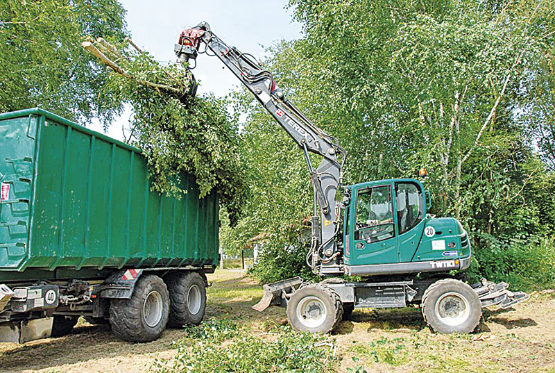 Unweit der Motorradrennstrecke Leineweberring im Bielefelder Stadtbezirk Heepen wird eine neue Versorgungstrasse für die Stadtwerke freigelegt. Für die Vorbereitungsarbeiten der 420 m langen Strecke setzt Olaf Krause aus Halle (Westfalen) mit seinem GaLaBau-Unternehmen auf einen Terex TW110. Mit einem Beha-Stein- und Recyclinggreifer entfernt der kompakte Mobilbagger Strauchwerk, Äste und kleine Bäume und bugsiert die sperrige Last auf einen 40 m³ fassenden Abfallcontainer. »Die Arbeit mit dem TW110 ist sehr angenehm«, sagt Fahrer Michael Böhne, der seit 21 Jahren im Betrieb tätig ist. Von der Leistung und den Fahreigenschaften des 11-Tonners von Terex mit 74,9 kW (102 PS) Dieselmotor ist er begeistert. Fahrantrieb und Arbeitshydraulik des TW110 sind unabhängig voneinander und bilden einen geschlossenen Hydraulikkreis. So steht Leistung zur Verfügung, die gerade bei solchen Einsätzen gefragt ist.