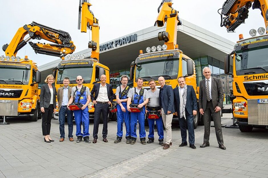 Bei der Übergabe der auf Lkw-Fahrgestellen von MAN aufgebauten vier Ladekrane – drei davon aus der Serie 92002 SH und einer aus der Serie 65002 SH – im MAN Truck Forum in München erläuterte Firmenchef Werner Schmidbauer im Gespräch mit dem bauMAGAZIN, warum man sich für Palfinger als Partner im Bereich Lkw-Ladekrane entschieden hat. »Wie unsere beiden anderen großen Partner MAN und Liebherr ist auch Palfinger ein Premium-Hersteller und bietet neben der hohen Qualität auch die Garantie für eine partnerschaftliche Zusammenarbeit«, sagte Schmidbauer. »Krantechnik von Palfinger ist was Besonderes. Das passt einfach.«