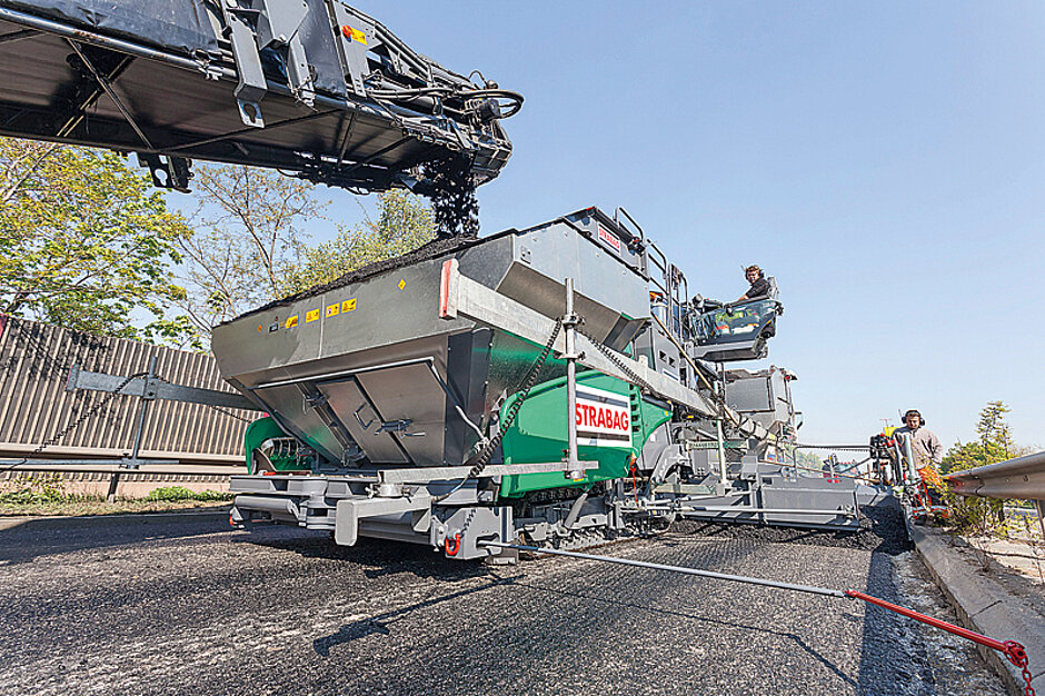 »Die Herausforderungen bei der Erneuerung von Straßen liegen häufig darin, die Belastungen für den Verkehr gering zu halten und die Wirtschaftlichkeit für die Auftraggeber zu steigern«, so Vögele-Produktmanager Björn Westphal. Die Heiß-auf-heiß-Herstellung von Binder- und Deckschicht hängt unmittelbar mit der Vögele-Hochverdichtungstechnologie zusammen: Damit die frisch eingebaute Binderschicht ungewalzt vom Deckschichtfertiger befahren werden kann, ist der Binderschichtfertiger Super 2100-3i IP mit einer AB 600 TP2 Plus-Einbaubohle ausgestattet. Im Inneren der Bohle befinden sich zwei hochverdichtende, impulshydraulisch beaufschlagte Pressleisten, die für sehr hohe Vorverdichtungswerte stehen.