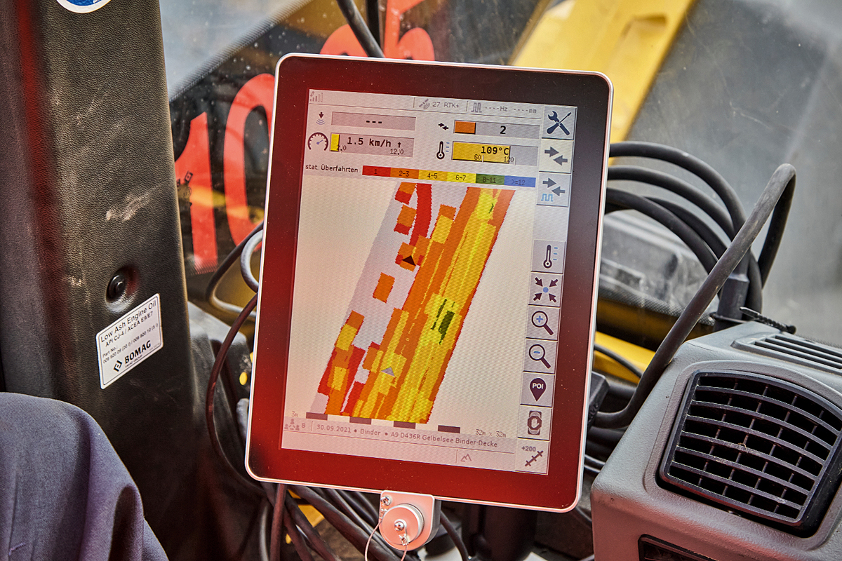 Ein wichtiger Erfolgsfaktor für die Tragfähigkeit und Langzeitstabilität der einzelnen Asphaltschichten ist die fehlerfreie Bauausführung. Dabei nehmen die Einbauteams die Schlüsselrolle im Prozess auf der Baustelle ein: in der Planung der Baumaßnahme und den eingesetzten Maschinen, bei deren Durchführung und der Reaktion auf äußere Bedingungen sowie der Bewertung der Baustelle mit ihren Kennwerten. Mittels CompactDoc wird die Bauzeichnung und das Aufmaß in ein Projekt geladen, die Maschinen und Navigatoren kommissioniert, Sollwerte gesetzt, aber auch das gesamte Projekt ausgewertet. Dabei habe sich gezeigt: Was gemessen und aufgezeichnet wird, wird erledigt. Nutzer des Völkel-Navigators begreifen ihn nicht als Kontrollinstanz, sondern als Ansporn, die eigene Arbeitsweise zu verbessern, so Völkel.