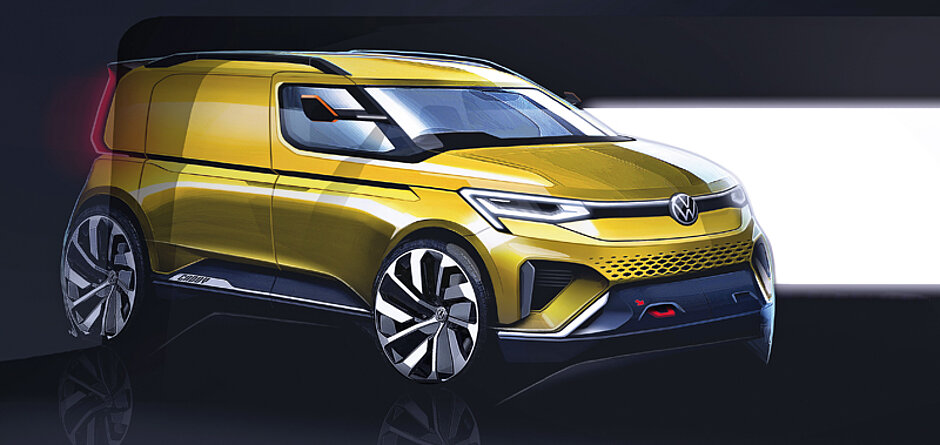 Mehr Sportlichkeit im Segment deuten Skizzen aus der frühen Entwicklung des neuen Caddy mit einer leicht abfallenden Dachlinie an. Skulptural geformte, große Seitenflächen sollen dem Caddy zudem künftig ein schlankes Design aus einem Guss geben. In der Cargo-Version des neuen Caddy zeigen sich am Heck stärker vertikal angeordnete, schlanke LED-Leuchten. Die Studie zeigt zudem eine größer wirkende Heckscheibe. In den kommerziell genutzten Versionen des neuen Caddy wird es gemäß Kundenansprüchen auch eine nicht einsehbare Heckklappe oder wahlweise weiter Flügeltüren geben.