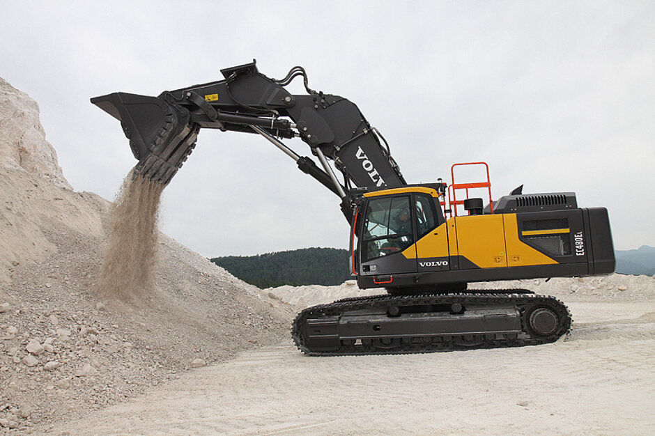 Die Auswahl der Ausrüstung in Steinbrüchen wird durch die Geologie, aber auch durch regionale Präferenzen beeinflusst. Weiter östlich werden häufig Hochlöffelbagger bevorzugt«, berichtet Peter Lam als Spezialist für Abbruch- und Sonderlösungen von Volvo CE u. a. in Europa. »Der Hauptvorteil der Hochlöffel ist die hohe Ausbrechkraft, die durch die Kinematik von Ausleger und Stiel erzeugt wird, sodass mit größeren Löffeln und einer höheren Produktivität gearbeitet werden kann. Es hat auch Vorteile im Vergleich zu Radladern bei Arbeiten auf engstem Raum«, so Lam.