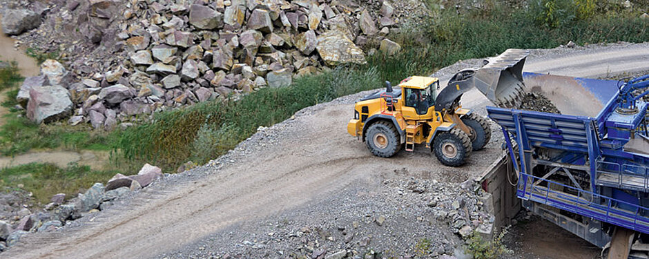 Zwei weitere Volvo-Maschinen verstärken den Fuhrpark: ein L180H in der Rückverladung und an der Bruchwand sowie ein L150H in der Lkw-Verladung und im Umschlag von Gleisschotter. Ihre eingebauten Radlader-Waagen ermöglichen ein korrektes Beladen aller Lkw und auch Bahn-Waggons auf dem eigenen Bahnanschluss. Die OptiShift-Getriebe sorgen bei allen drei Maschinen für schnelle Ladespiele und fließende Bewegungen. §