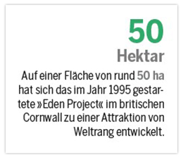 Mehr als 600 000 Besucher im Jahr, spektakuläre Bauten und darin mediterranes oder gar tropisches Klima im Südwesten Englands: Auf einer Fläche von rund 50 ha hat sich das im Jahr 1995 gestartete »Eden Project« im britischen Cornwall zu einer Attraktion von Weltrang entwickelt. Die riesigen Gewächshäuser, die aus verbundenen geodätischen Kuppeln bestehen (und mit ihrem futuristischen Erscheinungsbild schon als James Bond-Filmkulisse dienten), beherbergen atemberaubende Biome, die die natürlichen Welten des Amazonas und des Mittelmeers nachbilden.