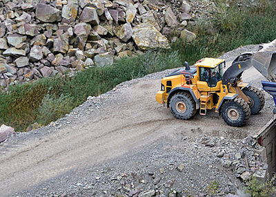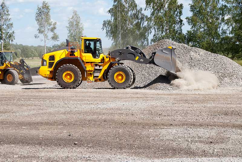 Auch bei den Radladern hat Volvo ein neues Flaggschiff, nämlich den L350H mit einem Einsatzgewicht von bis zu 56 t. Er besticht laut Volvo durch eine verbesserte Kraftstoffeffizienz, weitere Komponenten zur Leistungssteigerung, hat einen geänderten Antriebsstrang, eine neue Hydraulik sowie eine neue Fahrerumgebung. Er wird von einem D16J-Motor gemäß Stufe IV mit einer Leistung von 397 kW angetrieben, der bereits bei niedrigen Drehzahlen ein hohes Drehmoment bereitstellt. Der L350H ist auf maximale Leistung ausgelegt. Mit seiner Felstrapezschaufel eignet er sich ideal für die Arbeit im Steinbruch.