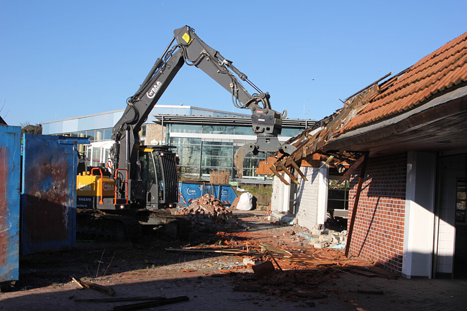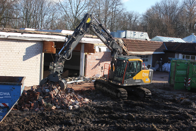 Die bisherigen Einsatzerfahrungen sind jedenfalls hervorragend und die Mitarbeiter extrem zufrieden, betont der Firmenchef. „Die Fahrer loben die Möglichkeit, filigrane Arbeiten dank der exakten Steuerung und leichten Bedienbarkeit sehr einfach durchführen zu können.“ Genau solche Arbeiten sind es, die der EC140E aktuell auf einer prestigeträchtigen Baustelle der Stadt Werne übernimmt. Hier wird nach langer öffentlicher Diskussion das in die Jahre gekommene alte Solebad mit Saunaanlagen abgerissen und anschließend durch einen modernen Neubau ersetzt. Das Auftragsvolumen liegt bei fünf Millionen Euro. Die Abbrucharbeiten haben im November 2016 begonnen. Hier zeigt der Bagger, wo seine Stärken liegen. Er reißt flache Vorbauten und Seitenflügel ab, ehe der EC360 für den Abbruch der größeren Gebäudeteile anrückt. Aber damit nicht genug: Der EC140E hilft mit bei der Anlage einer Baustraße, bei der Erschließung und der Erstellung der Fundamente und Bodenplatten. Maschinist Marcello Cordova fühlt sich auf dem Bagger wohl: „Die große Kabine ist komfortabel und bietet beste Übersicht. Der Bagger arbeitet leise und feinfühlig, und der Wechsel der Anbaugeräte ist durch den vollhydraulischen Schnellwechsler im Handumdrehen erledigt.“