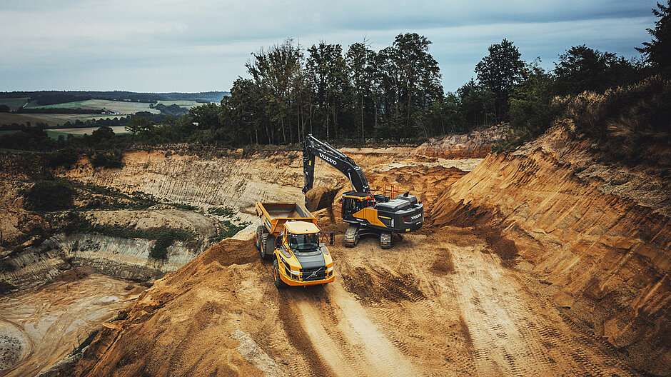 Kraftvoll und unermüdlich gräbt sich der neue Volvo EC380E Hybrid in den Bergkies und steht dabei nur wenige Meter vom Abgrund entfernt. Das sieht nicht nur beeindruckend aus, sondern spart auch ordentlich Sprit. Denn bei seinem Einsatz im Kiesbergwerk der Firma Eichstetter verbraucht er bis zu 15 Prozent weniger Kraftstoff als sein nicht-hybrider Kollege, der Volvo EC380E.