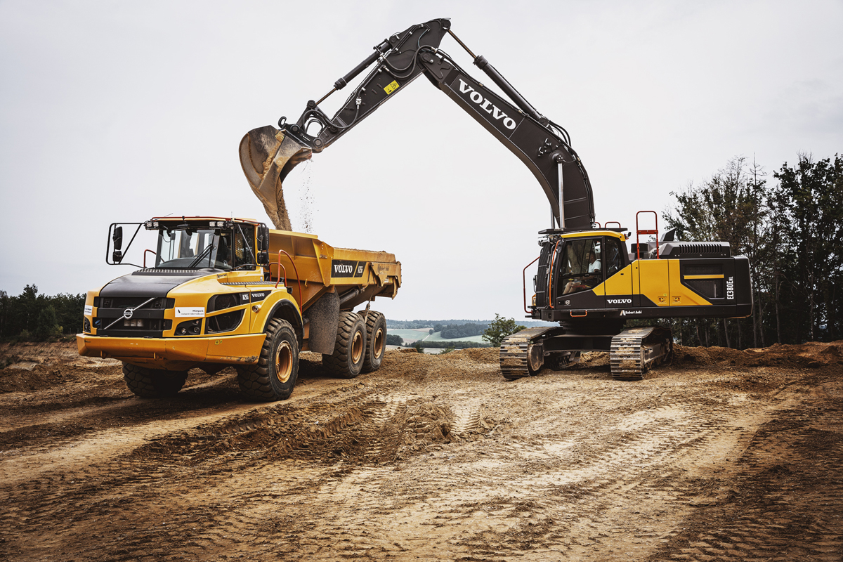 Der neue Volvo EC380E Hybrid befüllt den Volvo A25G schnell und effizient.