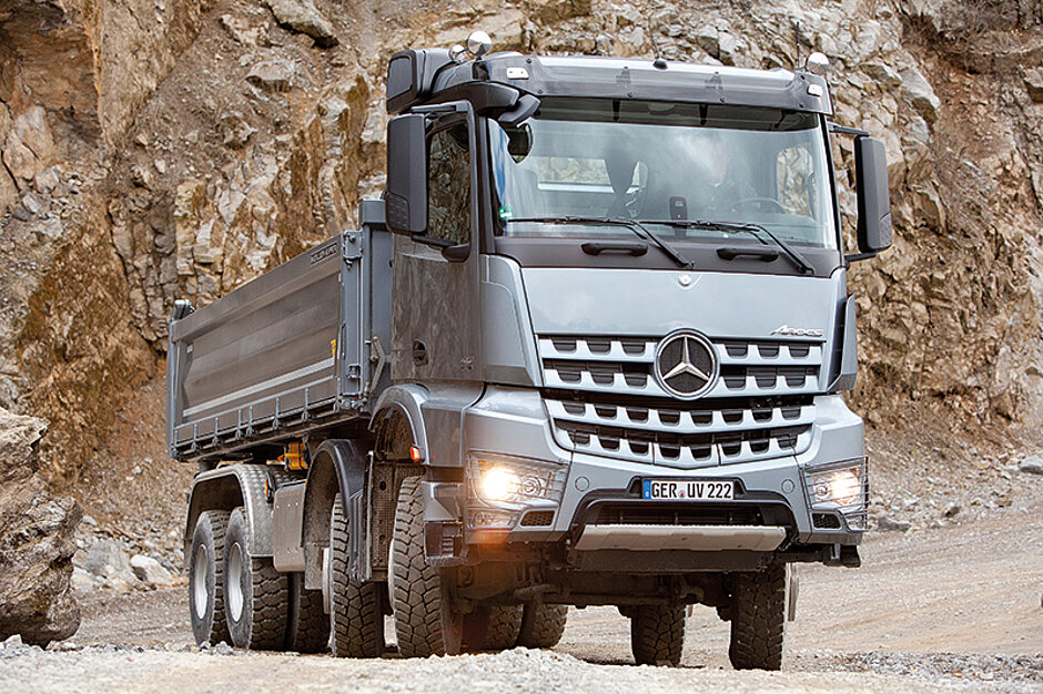 Im Mittelpunkt der Mercedes-Benz-Lkw für die Bauwirtschaft steht die »A-Mannschaft«. Ihr Zentrum bildet der Arocs, die spezialisierte Lkw-Baureihe für den Bauverkehr. Der Arocs feierte seine Weltpremiere auf der Bauma 2013, jetzt ist er mit seinem vollen Programm lieferbar. Dazu gehört zum Beispiel der Arocs HAD mit dem zuschaltbarem Allradantrieb Hydraulic Auxiliary Drive. Zur Bauma 2016 erweitert Mercedes-Benz das Spektrum des Arocs um ein neues Hypoidachs-Tandem in zwei Ausführungen (2 x 10 t und 2 x 13 t) für noch höhere Effizienz, um Fahrerhausvarianten mit niedrigem Einstieg und um zusätzliche Ausstattungsvarianten wie ein Cockpit mit hellem Interieur und optionaler Ausstattung mit Home-Line oder Style-Line. Mit sechs Fahrzeugen demonstriert der Arocs auf der Bauma sein Können.