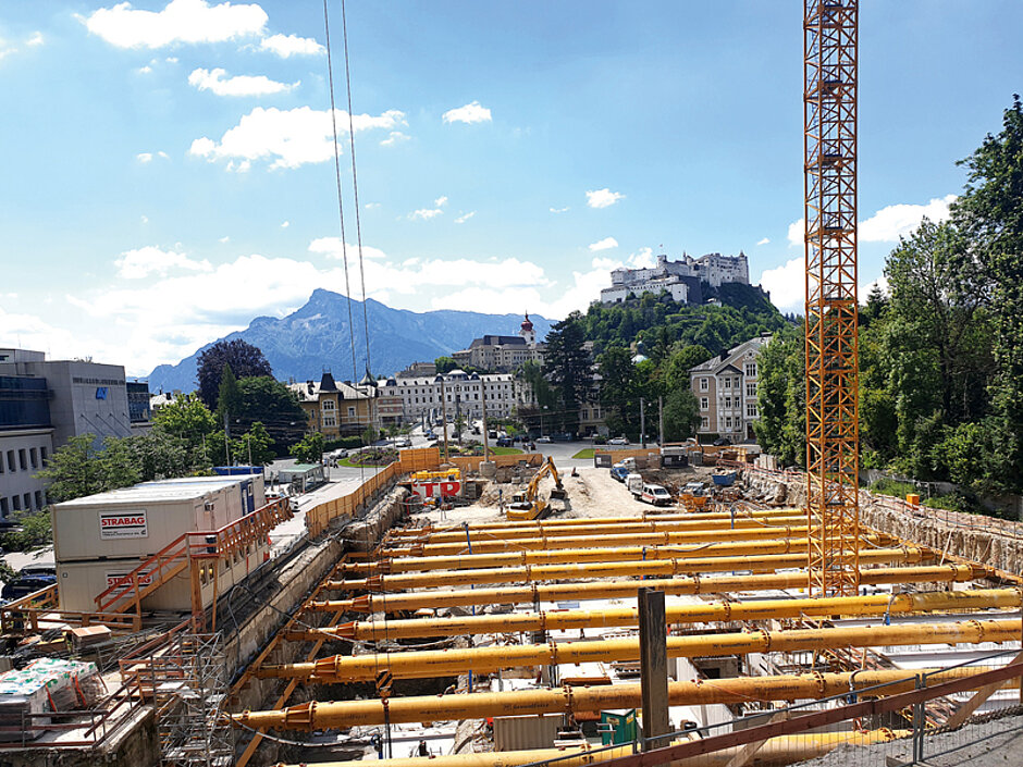 Wie Dipl.-Ing. Matthias Sadrawetz der Strabag-Direktion AV-Hochbau Salzburg berichtet, hatte man zunächst einen konventionellen Stahlbau für die Baugrubensicherung in Betracht gezogen, entschied sich dann aber für das Groundforce-System. Ausschlaggebend für den Zuschlag sei neben den erheblich geringeren Ein- und Ausbauzeiten für die Hydrauliksteifen und der einfachen Handhabung der Komponenten vor allem auch die hohe Systemflexibilität gewesen.