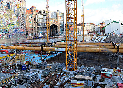 Peter Richardson, Groundforce Director Major Projects Europe, sagt dazu: »Wir haben für das Projekt Imbergplatz insgesamt 47 verschiedene Steifen in der Größenordnung MP250, MP375 und MP750 bereitgestellt. Nach Vorgabe des Bauträgers sollen die Arbeiten in drei Bauphasen durchgeführt werden, wobei die Steifen in mehreren Einbauebenen verwendet werden. Hier bietet unser System einen deutlichen Vorteil im Vergleich zu verschweißten Stahlträgern. Ein auf Maß gefertigtes Stahlbauteil muss später aufwendig abgebrannt und wieder zugerichtet werden, wenn es an anderer Stelle wiederverwendet werden soll. Möglicherweise fehlen dann ein paar Zentimeter an der benötigten Länge und das Material taugt nur noch zum Unterfüttern. Im Gegensatz dazu lassen sich unsere Hydrauliksteifen in kürzester Zeit nach Vorgabe anpassen und können so in allen Bauabschnitten mit wenigen Abstrichen problemlos wieder eingebaut werden.«