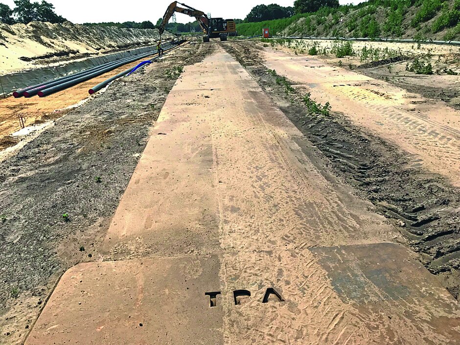 Bei den enormen Mengen an Aushub und Material, die vor Ort vom Team von De Romein bewegt werden müssen, war die Einrichtung einer stabilen und sicheren temporären Baustraße für die gesamte Logistik und eine zuverlässige Zeitplanung von ausschlaggebender Bedeutung. Entlang der gesamten Trasse wurde eine über 3 km lange Zuwegung aus TPA-Stahlpanels in einer Doppelspur gelegt, auf der sich Bau- und Transportfahrzeuge zügig bewegen können, ohne den Boden zusätzlich durch zu hohe Verdichtung zu belasten.