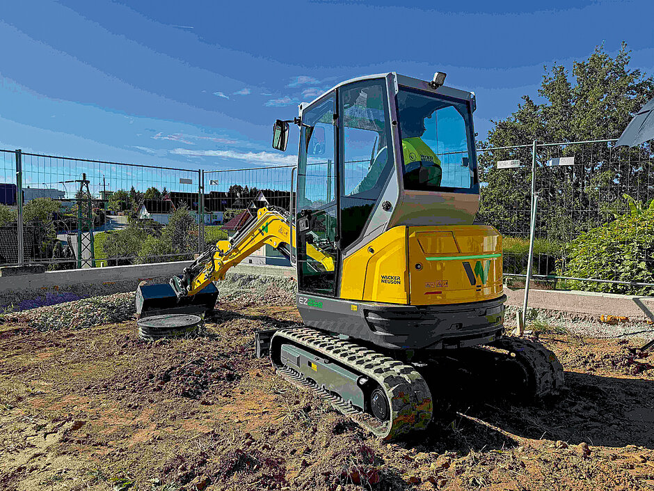 Aus dem »zero emission«-Angebot wurden die neuen E-Bagger »EZ26e« mit 2,6 t Nutzlast und »EZ10e« mit 1 t Nutzlast ausgestellt. Beide stehen den dieselbetriebenen Modellen der gleichen Klasse laut eigener Aussage in nichts nach. Der »EZ26e« ist mit den Batteriegrößen 30 kWh und 39 kWh erhältlich und kann über drei verschiedene Ladegeräte an einer Haushaltssteckdose (230 V) oder per Starkstrom (400 V) geladen werden. Der Minibagger ist als Zero-Tail-Modell nahezu ohne Hecküberstand konzipiert. Das macht ihn besonders wendig und kompakt und somit ideal für den Einsatz auf beengten Baustellen oder im Innenraum. In Kombination mit seinem geringen Gewicht kann der »EZ26e« inklusive Anbauwerkzeug laut Wacker Neuson auf einem 3,5 t Anhänger transportiert werden.