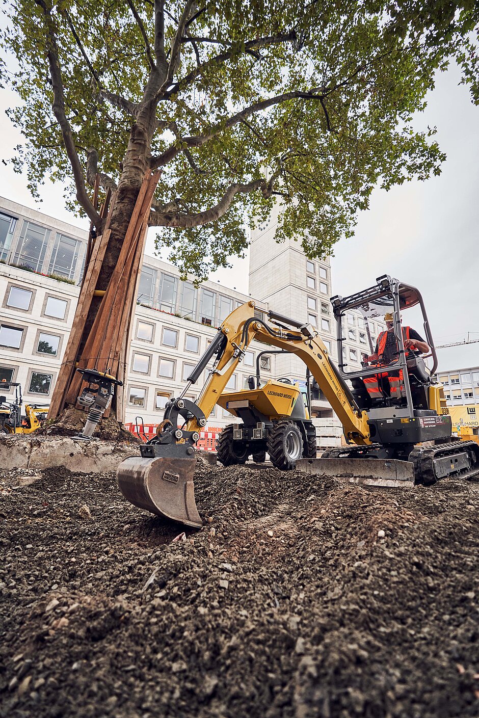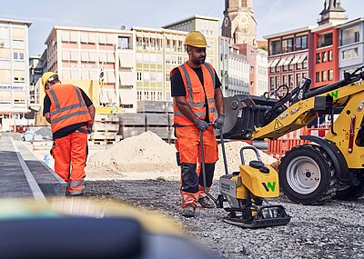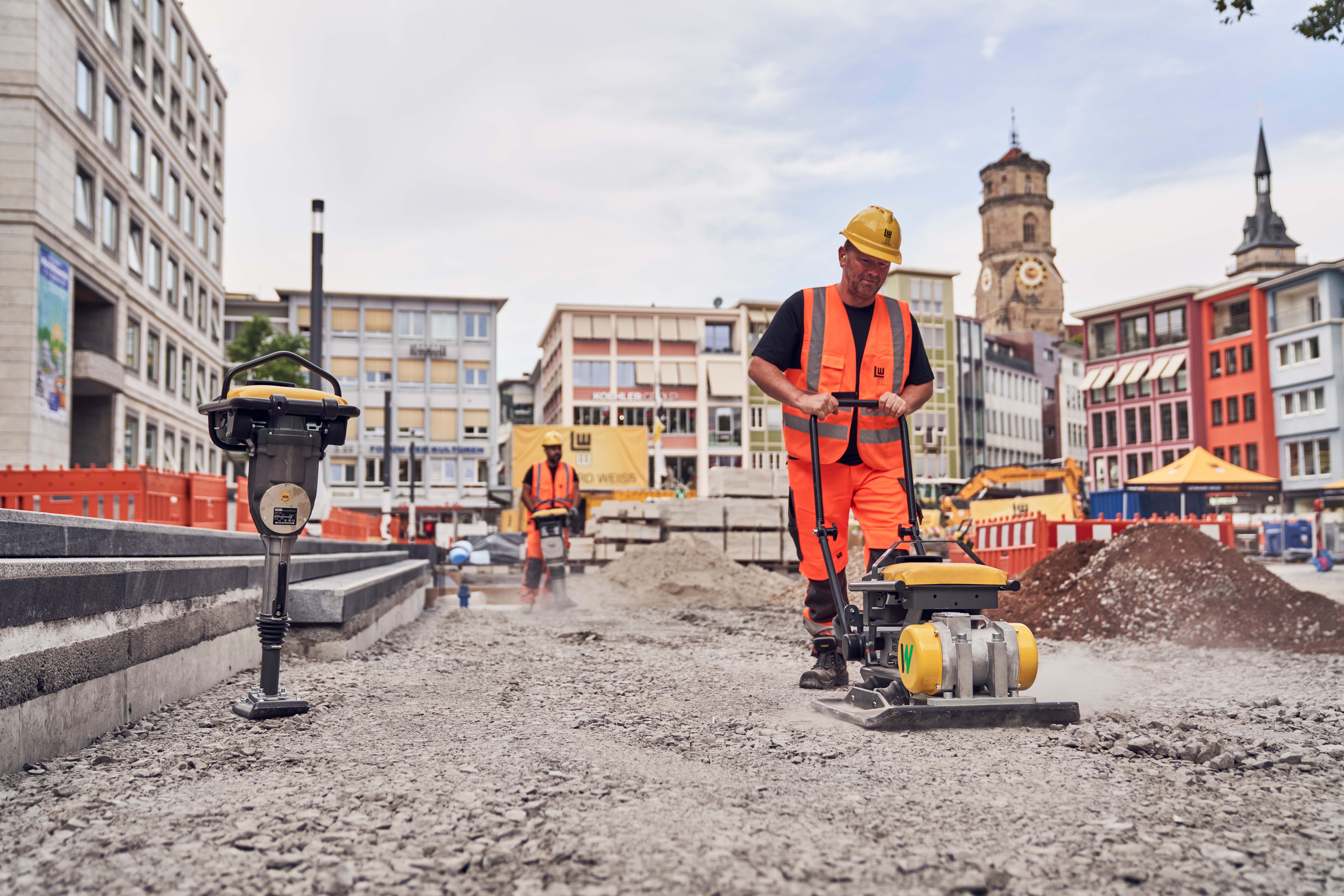 Im Zuge der Sanierung des Stuttgarter Marktplatzes mitten in der Innenstadt testete LEONHARD WEISS die gesamte zero emission Palette von Wacker Neuson. Das Bauunternehmen ist ein langjähriger Partner von Wacker Neuson und hat die zero emission Reise von Anfang an aus Anwendersicht begleitet. Nun kam das gesamte Portfolio – vom Akkustampfer bis zum Elektrobagger – auf der Baustelle zum Einsatz. „Sehr gut gefällt uns, dass die elektrischen Maschinen und Baugeräte dieselbe Leistung haben wie konventionelle“, betont Simon Schall, Leiter Zentrale Maschinentechnik bei LEONHARD WEISS. „Bei der täglichen Inbetriebnahme gibt es weniger Wartungspunkte als bei Geräten mit Verbrennungsmotor, Fahrer oder Bediener können sich viel leichter in die Maschine hineinfinden.“