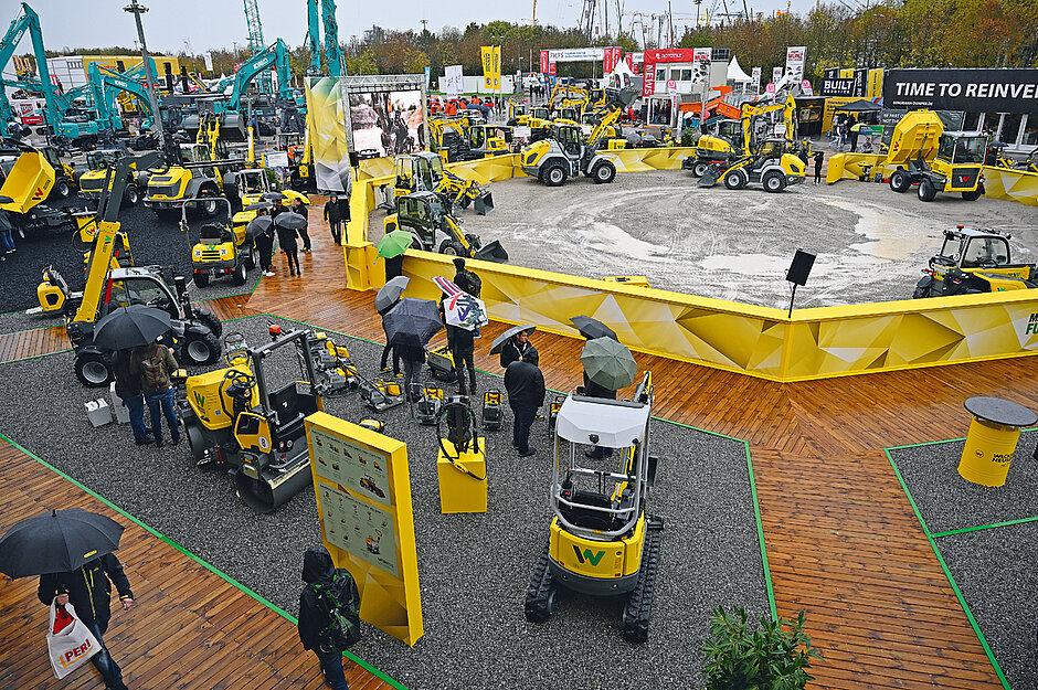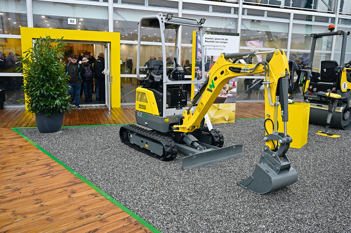 Teil des Wacker-Neuson-Auftritts war allerdings auch das bewährte Portfolio: Unter anderem vorgestellt wurden der E-Radlader WL20e, der seit 2015 in Serie produziert wird und nun mit leistungsstärkerem Akku vorgestellt wurde, sowie der bewährte Bagger EZ17e, der als erster vollelektrischer Zero-Tail-Minibagger ohne Hecküberstand auf sich aufmerksam gemacht hatte (das bauMAGAZIN berichtete in Heft 9/22, Seite 76). Dieser eignet sich insbesondere für den Einsatz in Innenräumen sowie abgas- und lärmbeschränkten Bereichen. Auf der großzügigen Demofläche in Oktagon-Form konnten Besucher zudem den Radlader WL28 unter die Lupe nehmen. Das 3 t schwere Modell besitzt kompakte Maße und eine hohe Wendigkeit bei hoher Leistung. Ein sichtoptimierter Vorderwagen, so Wacker Neuson, und das ausbalancierte Gewicht sollen eine möglichst hohe Kipplast ermöglichen.