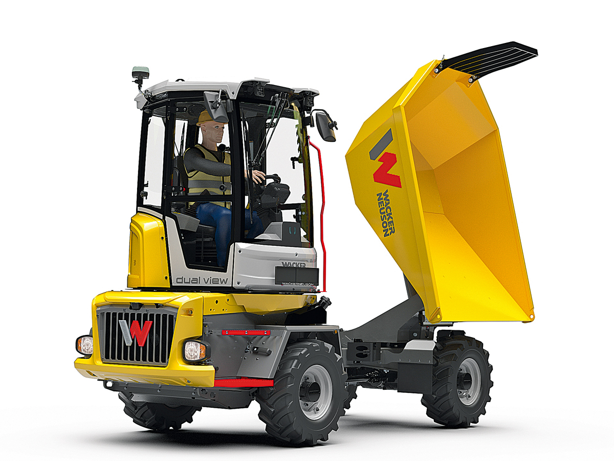 Eine weitere Innovation ist laut Unternehmen der Dual View Dumper DV45, das im Übrigen kleinste Dual-View-Modell bislang. Die elektrohydraulisch drehbare Kabine lässt sich nun per Knopfdruck am Joystick um 180° nach vorn und hinten sowie um 90° zur Seite drehen. In diesem Multi-View-Modus lässt sich der DV45 auch mit einer seitlich gedrehten Kabine fahren.