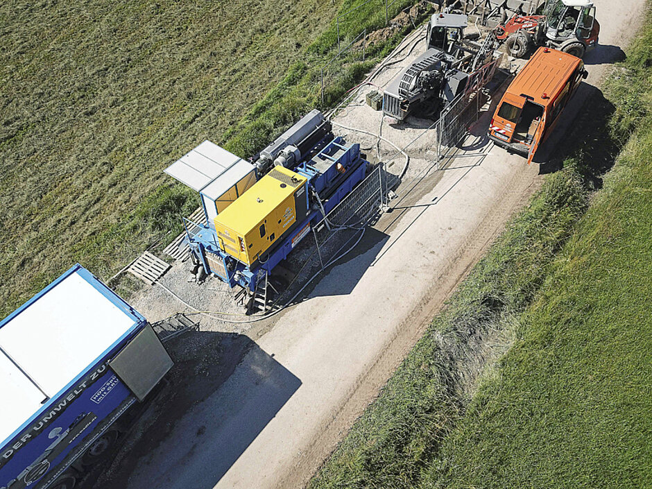 Um das bei horizontalen Spülbohrungen gelockerte Material effizient an die Oberfläche zu befördern und minimal in die Baustellenumgebung eingreifen zu müssen, wird das Spülbohrverfahren genutzt. Dabei können verschiedene Rohrleitungen nahezu ohne Aufgrabungen und mit geringsten Flurschäden verlegt werden. Bei dem aktuellen Auftrag handelt es sich um eine 20-kV-Leitung zwischen den Orten Postbauer-Heng und Berg zur Verstärkung des Versorgungsnetzes eines Energieversorgers. »Eine der größten Herausforderungen bilden die teils unterschiedlich beschaffenen Abschnitte«, berichtet Wadle-Bauleiter Rainer Rothenaicher. »Wir müssen über 390 m entlang eines Steilhangs in teils felsigem Untergrund arbeiten. Dabei gilt es, das freigebohrte Material zügig zu entnehmen und zu separieren, ohne dass Bohrwerkzeug oder Spülvorgang in Mitleidenschaft gezogen werden.«
