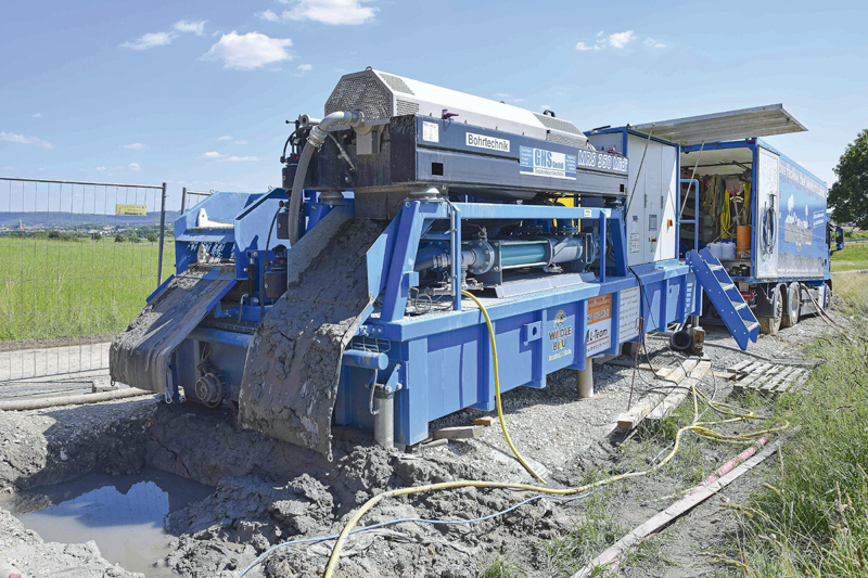 Die modular aufgebaute Anlage steht auf einer mobilen Unterkonstruktion und arbeitet weitestgehend automatisch. »Zu Beginn wird dem zugeführten Frischwasser die benötigte Menge Bentonit in Abhängigkeit von der Bodenbeschaffenheit in einer Mischanlage zugesetzt, um die Tragfähigkeit des Wassers zu erhöhen«, erklärt Torsten Mickel, Mitglied der Geschäftsführung bei L-Team Baumaschinen. »Diese Suspension wird dann durch das Bohrgestänge in den Boden gepumpt. Entlang des Bohrgestänges fließt die Bohrsuspension mit dem losgebohrten Bohrklein zusammen zurück in die Startgrube.« Dabei haftet das lose gewordene Material sozusagen an der Spülung und wird in einer Sammelgrube aufgefangen.