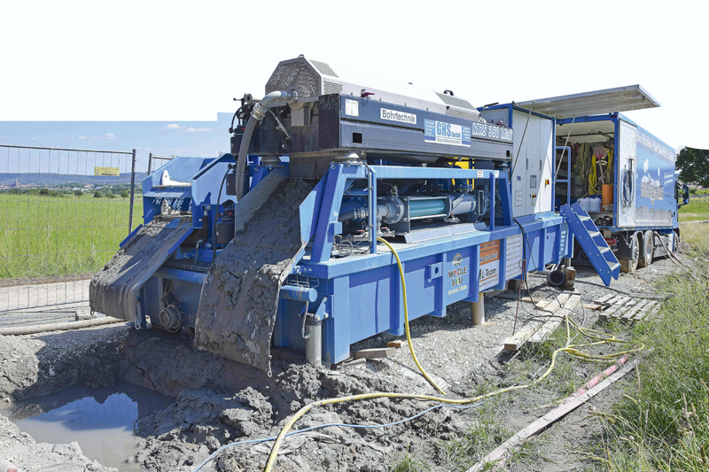 Ein einmaliger Durchlauf durch die Anlage ist ausreichend, um die Bohrspülung wiederverwenden zu können. Die gereinigte Suspension gelangt wieder zur Mischanlage, wo sie in die Bohrung eingebracht oder mit weiterem Bentonit angereichert werden kann. »Dadurch schließt sich der Kreis und wir können dieselbe Spülung drei oder vier Mal durchlaufen lassen, bevor sie erneut mit Frischwasser oder Bentonit angereichert werden muss«, berichtet Rothenaicher. »Dabei ist die Anlage so effizient, dass die Spülung die Anlage nur einmal passieren muss. Bei anderen Anlagen sind oft mehrere Durchgänge erforderlich, bis alle Feststoffe entzogen sind.« Das Kreislaufprinzip macht ein kontinuierliches Arbeiten der Anlage möglich. Indem eine Basissuspension nur mit neuem Wasser aufgefrischt und nicht neu angesetzt werden muss, fällt die insgesamt benötigte Wassermenge geringer aus und ebenso Nachfüll- und Wartezeiten, bis neue Wassertanks an der Baustelle verfügbar sind, lassen sich deutlich reduzieren. »Durch das effiziente Trennen werden auch höhere Spülmengen ermöglicht, wobei der gesamte Bohrstrang vor Verschleiß geschützt wird. Feststoffe werden schneller ausgetragen und belasten dadurch das Bohrgestänge und -werkzeug weniger durch Reibung«, so Mickel. »Diese hochwertige Technik ist angesichts des hohen Durchsatzes elementar, denn es können täglich bis zu 250 m³ aus gebrauchter Spülung aufbereitet werden.«