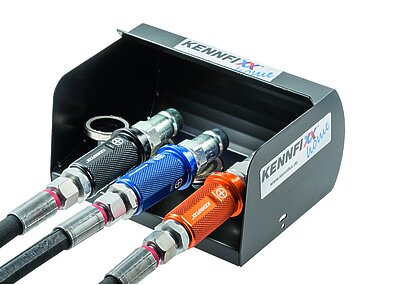 Kennfixx kann einen bedeutsamen Beitrag insbesondere für Hersteller von Anbaugeräten liefern. Die griffsicheren Kennzeichnungsstücke werden als vor- oder fertigmontierter Satz mit ISO-A-Steckkupplung oder Flatface-Kupplung und Schraubeinheit zwischen dem Schlauch und der Kupplung montiert. Aus eloxiertem Aluminium gefertigt sind sie in bis zu 13 Farben erhältlich, wobei ein Plus- bzw. Minuszeichen eine zusätzliche Differenzierung zwischen Vor- und Rücklauf ermöglicht.