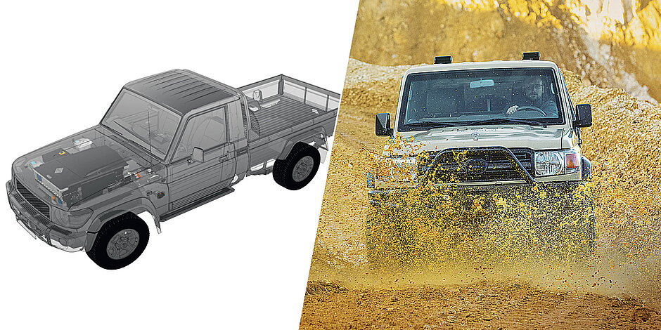 Als hilfreich für die genannten Anwendungen soll sich Webastos integriertes Standardbatteriesystem erweisen. Im E-Land-Cruiser verfügt das modulare und skalierbare System über 400 V und bietet eine Kapazität von 35 kWh. »Im Vergleich zu anderen chemischen Alternativen überzeugt die Lithium-Ionen-Batterie vor allem durch ihre Energiedichte. Dank dem ausgezeichneten Verhältnis zwischen Leistung und Gewicht ist das Fahrzeug sogar etwas leichter als mit seinem originalen Antriebsstrang«, betont Schneider. Dementsprechend bleibe die Zuladungskapazität innerhalb des Wagens unverändert, was gerade in Bezug auf die oft schwere Ladung im Tagebau einen Pluspunkt darstellt. Um dort eine hohe Sicherheit zu gewährleisten, ist das Batteriesystem gemäß IP67 gegen das Eindringen von Staub sowie Wasser geschützt. Es ist zudem in einem robusten Gehäuse verbaut.