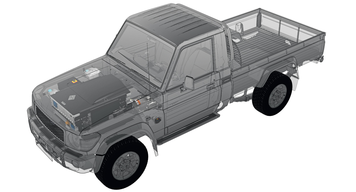 Bei der ersten Elektrifizierung des Land Cruisers galt es einige Herausforderungen zu meistern, alle Bestandteile des neuen Antriebsstrangs mussten in die Karosserie und die bestehende Struktur eingepasst werden. Zudem war es notwendig, die Kommunikationsarchitektur des Fahrzeugs neu zu entwickeln, da abgesehen von den mechanischen keine weiteren Schnittstellen zur Verfügung standen.