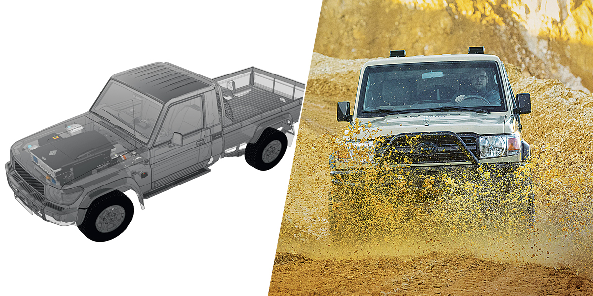 Für die Umrüstung der Land Cruiser liefert Huber Automotive seinen eigenen Werken und weltweiten Partnern jetzt eine Systemlösung. »Nur so können sie das Fahrzeugkonzept einfach und schnell realisieren. Gleichzeitig erfordert das im Hinblick auf das System eine hohe Qualität und Modellierbarkeit«, so Fabian Schneider, Key Account Manager bei Huber Automotive. Darüber hinaus ist der E-Cruiser im täglichen Einsatz in unwegsamem Gelände, was sehr hohe Ansprüche an das Produkt stellt, die über die üblichen Anforderungen in der Automobilindustrie hinausgehen. Im Minenbetrieb fahren die Electric Cruiser regelmäßig auf Schotterwegen und durch Schlaglöcher. Fahrzeuge werden verschlammt und haben in Salzbergwerken mit einer entsprechenden Korrosion zu kämpfen.