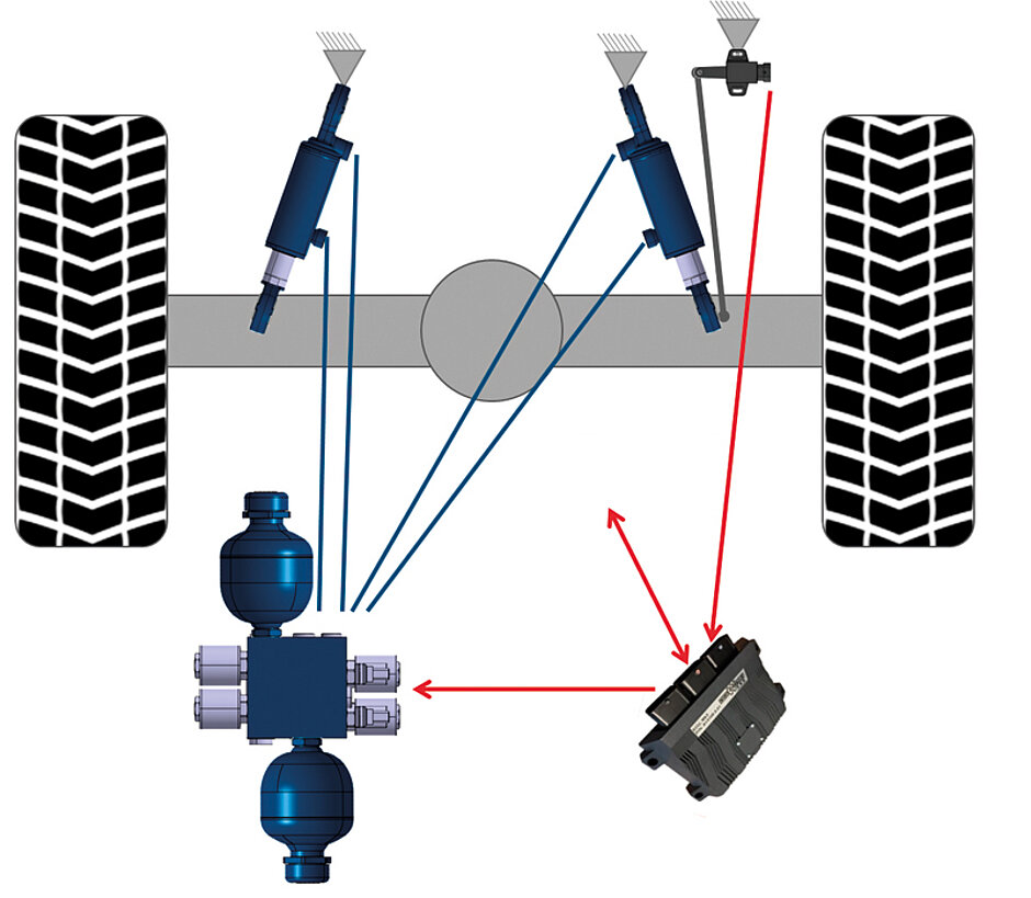 Die Federung ist semiaktiv (mit aktiv reagierender Dämpfung), adaptiv (mit einstellbarer Dämpfung) oder passiv (mit voreingestelltem Dämpfungsverhalten) einsetzbar. Das passive Federungssystem ist prädestiniert für gleichbleibende Umgebungsbedingungen, etwa bei gleichbleibenden Lasten. Die semiaktiven und adaptiven Pendants hingegen eignen sich besonders für den Einsatz in unterschiedlichen Fahrsituationen oder bei wechselnden Lasten – beispielsweise für Fahrten auf Straße und schwerem Gelände. Zu diesem Zweck sind die Systeme mit einem Winkelsensor und Controller, einem Ventilblock für Niveauregulierung sowie einer adaptiven Dämpfung ausgestattet.