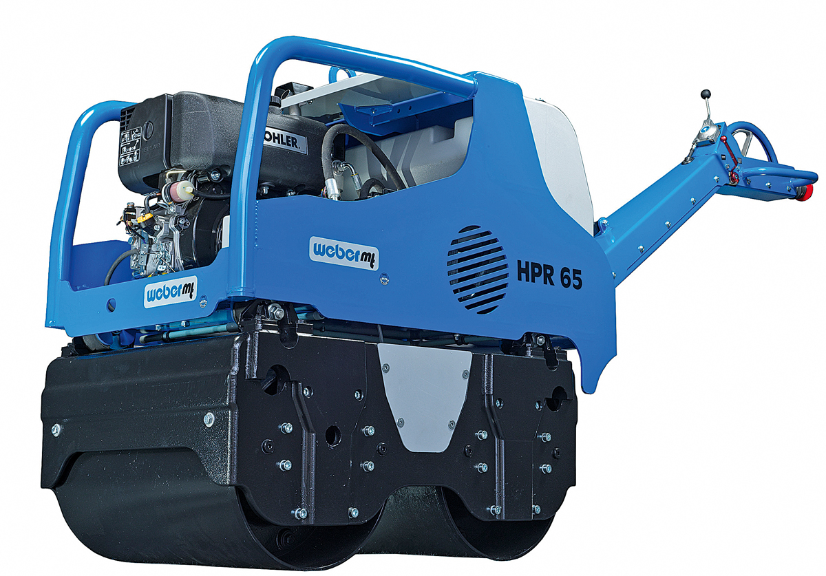 Weber MT erweitert sein Programm ebenso um die handgeführte Vibrationswalze HPR 65, bei der die Produktentwickler dem Konstruktionsprinzip »Motor vorn – Wassertank hinten« treu geblieben sind. Die 65 cm breite Vibrationswalze wird von einem Kohler-Diesel KD15-440 angetrieben, der über einen Elektrostart verfügt. Mit dem 70 l fassenden Wassertank sind lange Einsatzzeiten auf Asphalt möglich. Seitenfreiheit bzw. geringe seitliche Überstände sollen das Arbeiten dicht an Hauswänden gewährleisten.