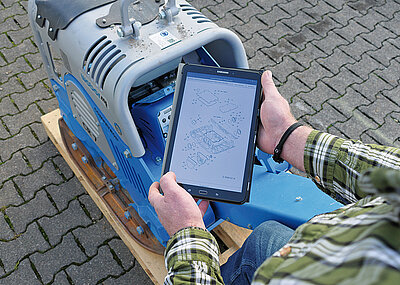 Neuartig und dennoch leicht verständlich gibt sich die serienmäßige Funkfernsteuerung. Während des Betriebs wird ein zweiter Akku direkt an der Maschine geladen – Fernsteuerung und Maschine sind so stets einsatzbereit. Das farbige Display der Fernbedienung gibt Auskunft über die aktuellen Steuerbefehle und ermöglicht zudem eine Maschinendiagnose. Neben Motorkühlung, Ölmangel oder Luftfilterverschmutzung werden beispielsweise auch die Betriebsstunden angezeigt.