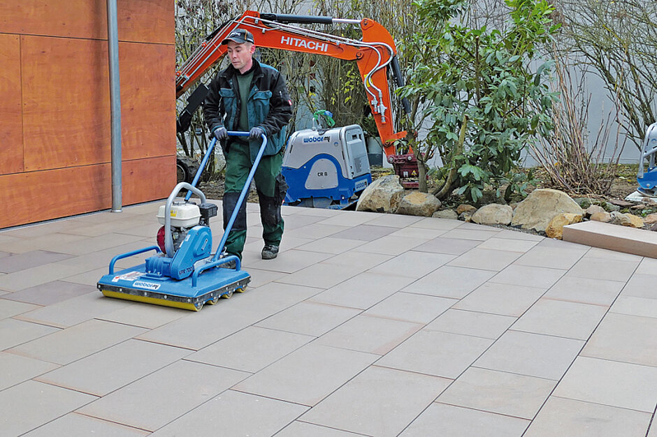 Einer, der sich Premiumqualität auf die Fahnen geschrieben hat, ist der Landschaftsgärtner Tobias Grabandt mit seinem Team. Das 5-Mann-Unternehmen aus Staufenberg im südlichen Niedersachsen setzt auch bei der Anschaffung von Baumaschinen auf Qualität und Zuverlässigkeit. »Die Arbeiten im GaLaBau sind körperlich anstrengend. Da nutzen wir jede Gelegenheit oder Maschine, die uns Erleichterung bietet. Ein gutes Beispiel ist der VPR-Rollenrüttler von Weber MT«, betont Tobias Grabandt. Er setzt den Rollenrüttler zum Abrütteln von Terrassen aus großformatigen Natursteinplatten oder Platten mit einer Oberflächenveredelung ein.