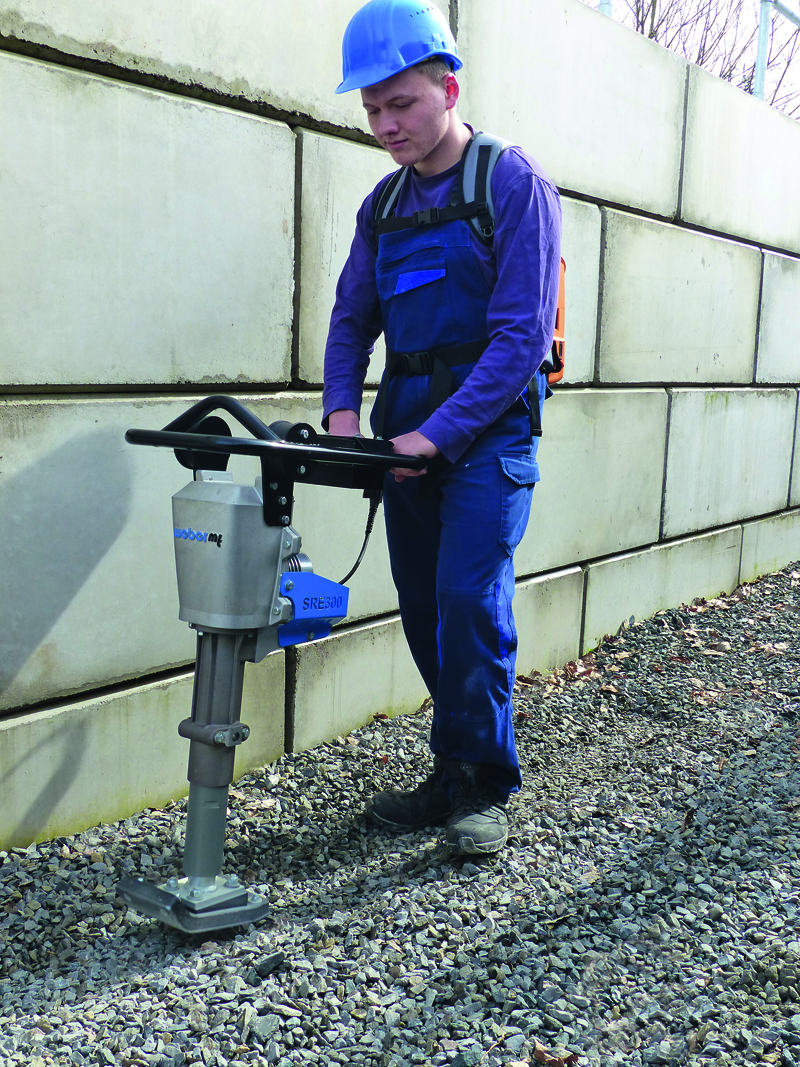 Das Sortiment der Vibrationsstampfer von Weber MT wurde um den lediglich 33 kg leichten SRE 300 erweitert. Ausgestattet ist der neue Stampfer mit einem Elektromotor, der über einen Akku mit reichlich Leistung versorgt wird. Der Akku wurde nicht direkt auf dem Stampfer aufgebaut, sondern wird vom Bediener ganz bequem wie ein Rucksack getragen. Zum Einsatz kommt ein Lithium-Ionen Akku des französischen Herstellers Pellenc. Der Energiegehalt von 1 220 Wh ermöglicht nach Anbieterangaben eine Einsatzzeit des Stampfers von bis zu 1 ¼ h.