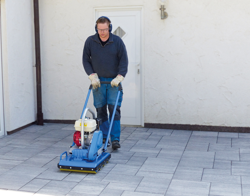 Die empfindlichen Betonplatten mit einer verhältnismäßig geringen Stärke lassen sich mit einem Rollenrüttler schonend in die Bettung drücken. Ebenso effektiv erfolgt das Einrütteln des Fugenmaterials in die Fugen. Effizientes Arbeiten mit den Rollenrüttlern gelingt auch bei beengten Platzverhältnissen, da der Führungsbügel umgelegt werden kann. Außerdem bestimmt der Bediener die gewünschte Arbeitsgeschwindigkeit selbst. §