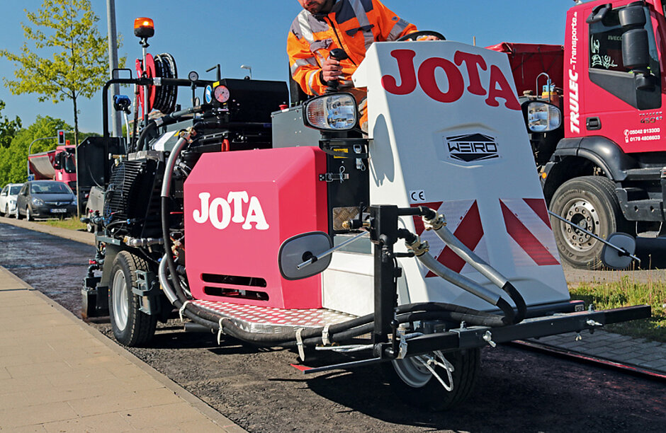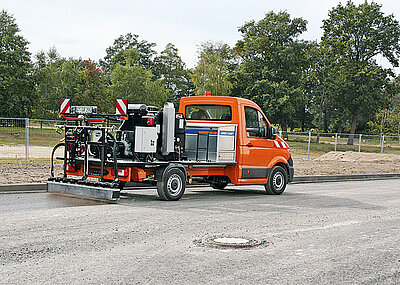 Anpassungen der Arbeitsbreite wurden auf dem Fahrerbedienpult über die elektro-pneumatische Ansteuerung der einzelnen Spritzdüsen vorgenommen. Die Wendigkeit des Dreiradfahrgestells ermöglichte zusätzlich das schnelle Umsetzen der Maschine, ohne den rollenden Verkehr auf der Hauptfahrbahn zu sehr zu beeinträchtigen.